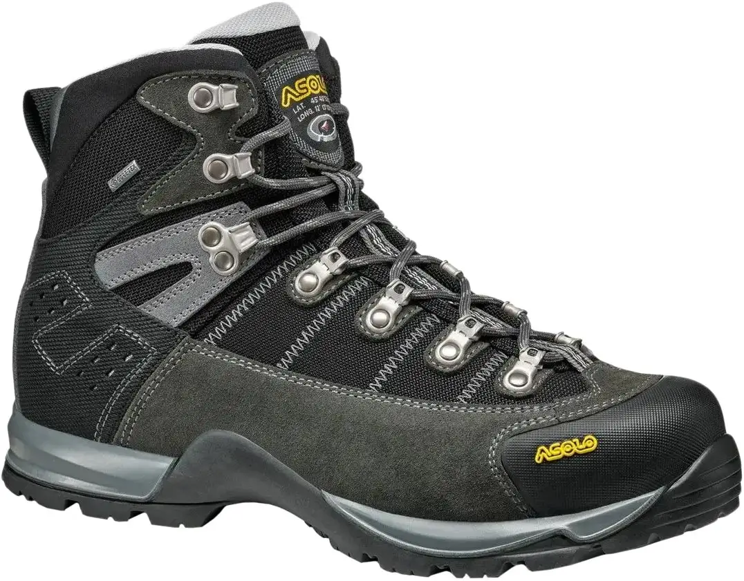 Черевики Asolo Fugitive GTX MM 42.5 Light black/greyЧеревики Asolo Fugitive GTX MM - взуття для хайкінгу, трекінгу та прогулянок на природі, яке може застосовуватися в осінньо-весняний період. Жорстка конструкція з натуральної замші завтовшки 1.6-1.8 мм і високоміцного нейлону відмінно фіксує ногу під час переміщення нерівними поверхнями. Підкладка містить мембрану Gore-Tex, тому за підвищеної вологості можна бути на 100% упевненим у збереженні сухості своїх ніг і достатньої вентиляції в спекотну погоду.
