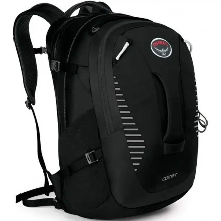 Рюкзак Osprey Comet 30 Reverie green/cetacean blБагатофункціональний рюкзак Osprey Comet міського типу. Він пошитий з міцного зносостійкого матеріалу - Nylon із щільністю 210D. Спинка виготовлена з дихального сітчастого матеріалу. М'які плечові лямки, нагрудний та поясний ремені забезпечують хорошу посадку рюкзака. Особливої уваги в цій моделі заслуговує місткість. Не дивлячись на компактні розміри рюкзака, в ньому поміститься змінний одяг, взуття, ноутбук 21", документи. Верхня кишенька розрахована для найчастіше використовуваних речей: ключі, телефон, пропуск, окуляри. Сітки та м'які вставки забезпечують безпеку крихких виробів. Бічні кишені з еластичного матеріалу. На передній панелі є додаткова ручка, яка дозволяє переносити рюкзак в горизонтальному положенні. Присутня внутрішня сітчаста кишеня, прихований фронтальний відділ і кишеня для MP3 плеєра. На стяжці в районі грудей вбудований свисток.