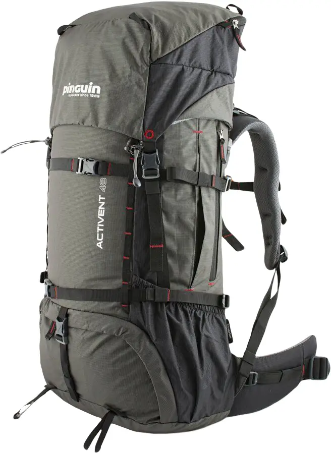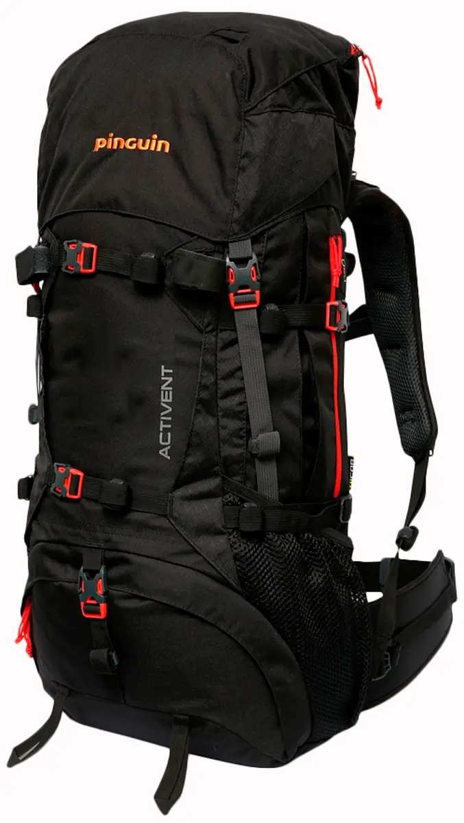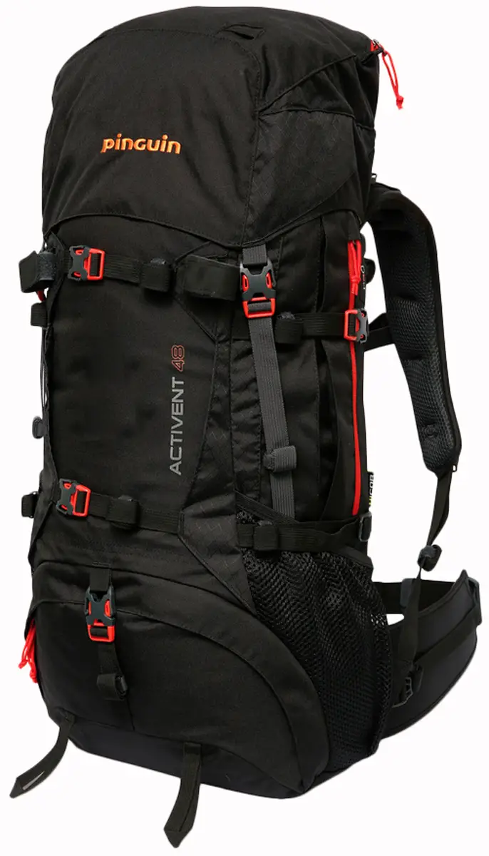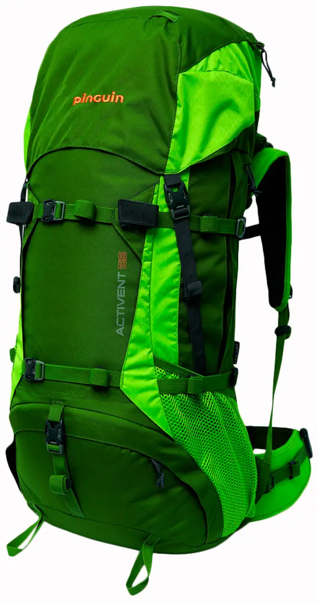 Рюкзак Pinguin Activent 55 BlackPinguin Activent - багатоцільовий рюкзак для походів на кілька днів у різні пори року. Досконала несуча система Pinguin Activent з регульованим по вертикалі плечовими ременями (це регулювання доступне тільки в рюкзаках об'ємом 55 літрів) і рухомим поясом на стегнах. Конструкцією передбачені дві бічні кишені під компресійними ременями, кишені всередині та зовні клапана, дві алюмінієві стійки (версія на 48 літрів має одну стійку) у задній частині рюкзака, внутрішня перегородка з блискавкою між відділами рюкзака.