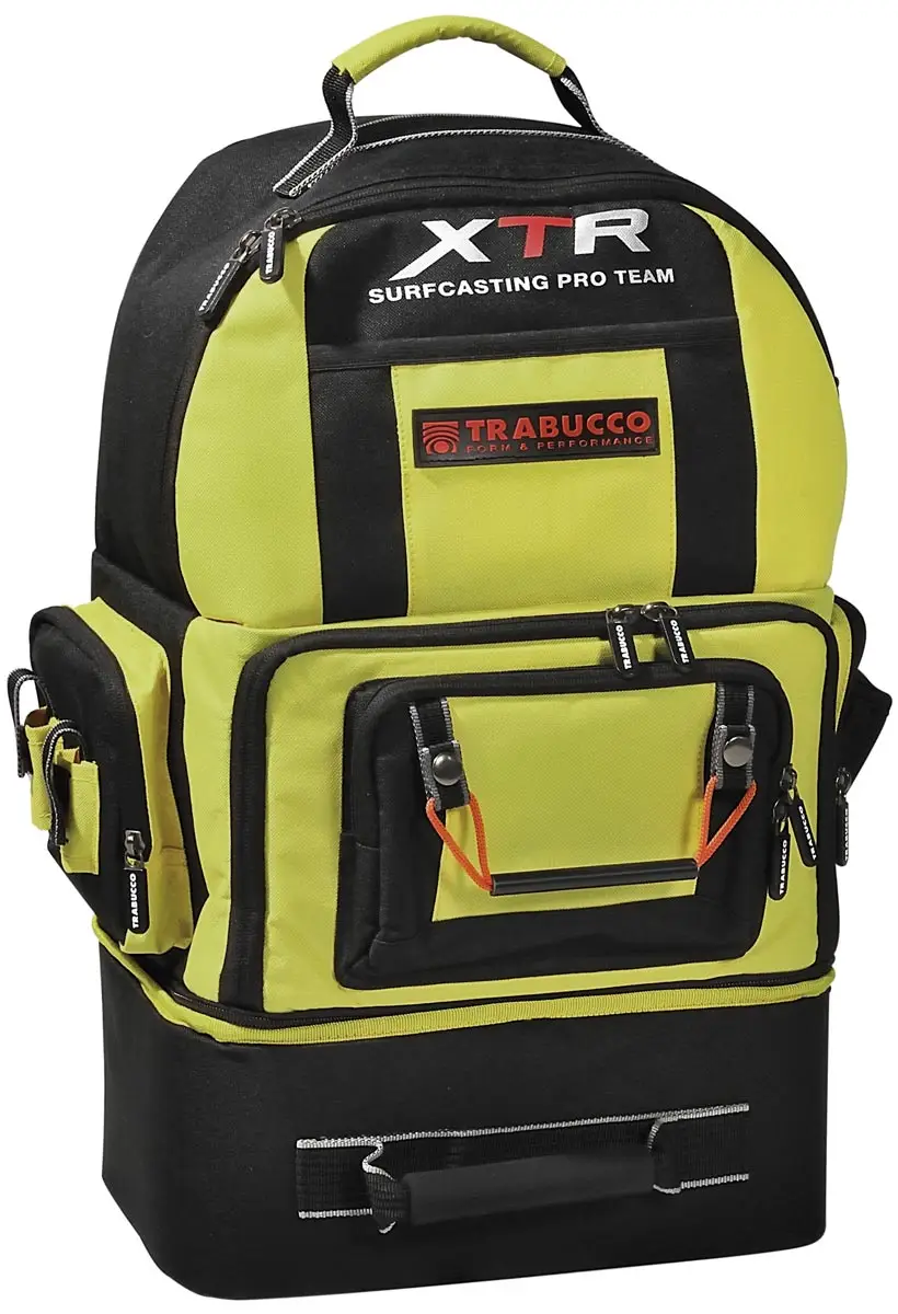 Рюкзак Trabucco XTR Surf Team Back Pack Match Black/greenРюкзак Trabucco XTR Surf Team орієнтований на заняття морською серфовою риболовлею. У його нижньому відділенні розташовані 4 пластикових коробки для снастей і аксесуарів. Решта кишень і верхнє відділення призначені для інструментів та інших речей, які можуть знадобитися на рибалці. Довжина м'яких наплічних ременів регулюється під особливості користувача, переносити рюкзак так само можна в одній руці за центральну ручку. Водонепроникний матеріал 1200D оберігає вміст від підвищеної вологості і чудово протистоїть зносу, завдяки чому рюкзак Trabucco XTR Surf Team має довгий термін служби