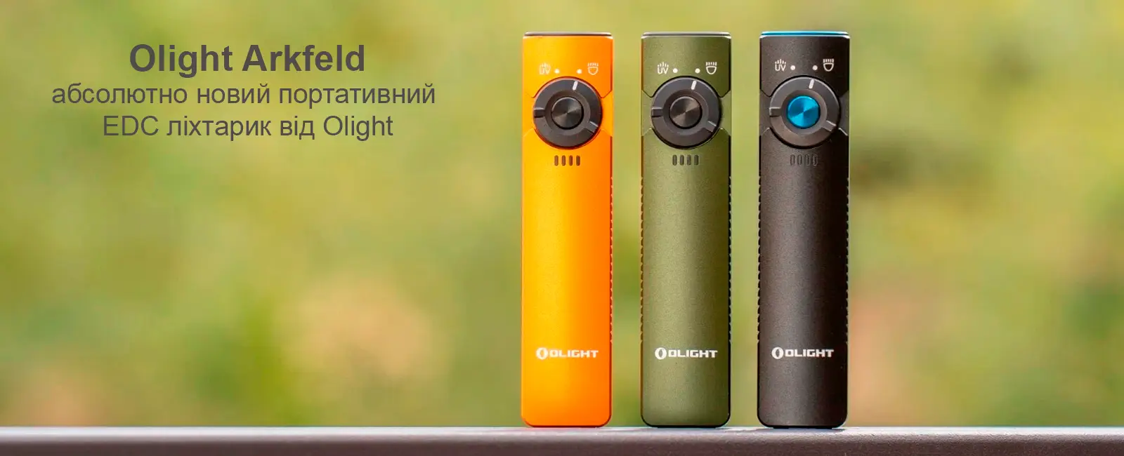 Ліхтар Olight Arkfeld BlackOlight Arkfeld — це абсолютно новий портативний EDC ліхтарик від Olight. Модель має 5 рівнів яскравості, а також функцію пам'яті, що дозволяє вибрати останній режим, який використовувався. Максимальний рівень яскравості становить 1000 люменів і здатний висвітлити кожен кут. Інтегрований зелений лазер – гарний помічник під час проведення презентацій. Ергономічний дизайн ліхтаря та перемикача (центральна кнопка та селектор) гарантує максимальний комфорт під час використання. Елементом живлення слугує Li-Po акумулятор ємністю 1050 mAh. Крім того, магнітний зарядний кабель дозволяє заряджати прилад не розбираючи. На тильній стороні передбачена зручна кліпса для носіння в кишені. Завдяки чудовому дизайну та численним функціям освітлення, Arkfeld може стати неперевершеним ліхтариком для повсякденного використання.