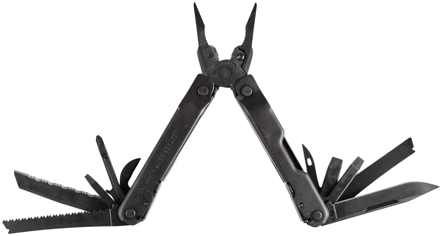Пасатижі, тонкі пасатижі, знімні кусачки зі сталі 154CM, знімні посилені кусачки зі сталі 154CM, кусачки для багатожильного дроту, обжим для електричних роз’ємів, ніж зі сталі 420HC, серрейторний ніж зі сталі 420HC, напилок по дереву/металу, середня викрутка, маленька викрутка, викрутка Phillips, шило з петлею, лінійка (9 inches/22 cm), відкривачка для пляшок, відкривачка для банок, інструмент для зачистки дротів.