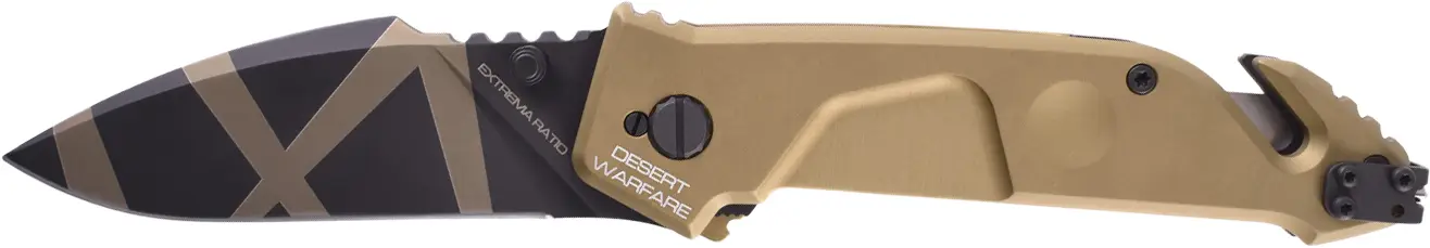 Широкий клинок профілю Drop Point наділяє ніж відмінними колючими і різальними якостями, а легована кобальтом сталь Böhler N690 твердістю 58 HRC добре витримує інтенсивні навантаження, у тому числі і поперечні. Фінішне покриття клинка Black Oxide MIL-C-13924 чудово захищає від корозії і може змінюватись в залежності від моделі: чисто чорне або з лазерним гравіюванням у вигляді маскувальних смуг. Для комфорту та впевненості під час використання, на обусі розміщений ряд масивних насічок для упору великим пальцем. Приводиться в робоче положення як лівою, так і правою рукою, за допомогою двостороннього шпеника. Фіксується у відкритому вигляді за допомогою надійного замка Liner Lock. Extrema Ratio подбала про безпеку і для запобігання випадкового відкриття був встановлений запобіжник, який надійно фіксує клинок у відкритому або закритому положенні. Також лінійка MF отримала нововведення – регулювальний осьовий гвинт, завдяки якому можна відрегулювати плавність виходу клинка.