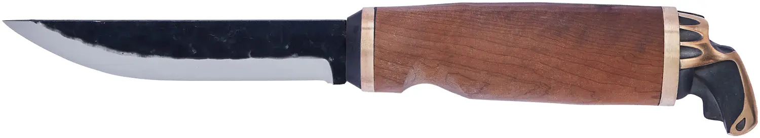 Руків’я виготовлене з деревини карельської берези. Термічна обробка деревини забезпечує руків’ю надійний захист від вологи. Для додаткового захисту був нанесений шар воску, що додатково захищає від зовнішнього впливу. Головною ж особливістю цього ножа - є вилитий з бронзи наконечник руків’я у формі голови лосося.