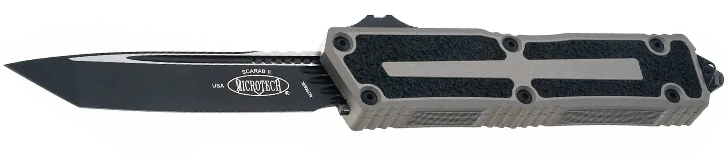 Ніж Microtech Scarab II GEN III T/E Black Blade TanНіж Microtech Scarab II з фронтальним викидом клинка (OTF) – це збільшена версія моделі Scarab. Крім розмірів Scarab II відрізняється більш легким і плавним ходом повзунка, який відповідає за викид клинка, форма і тип обробки якого будуть також відрізнятися в залежності від моделі. Алюмінієве руків'я з текстурованими вставками з композитного матеріалу сприяє надійнішому утриманню ножа. В моделі передбачений склобій, отвір для кріплення темляка і широка кишенькова кліпса з зображенням скарабея.