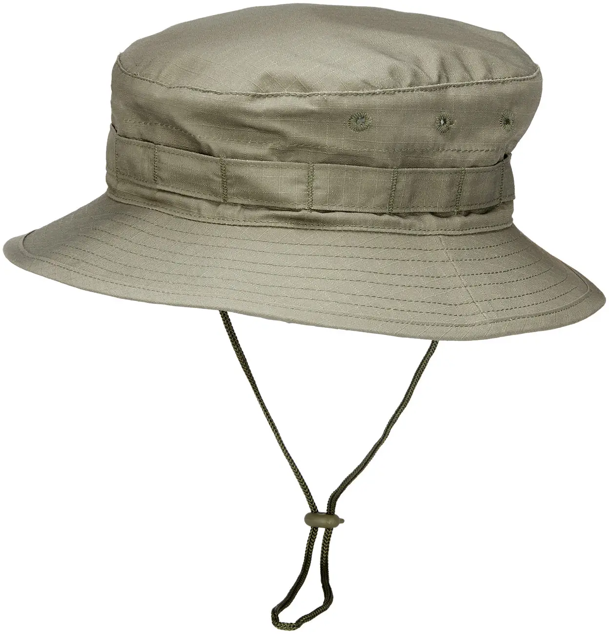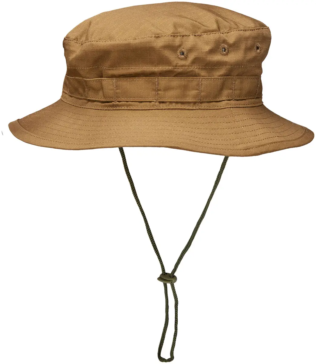 Панама выполнена из смесовой ткани с плетением Rip-Stop, состоящей из полиэстера (80%) и хлопка (20%). Данный материал обеспечивает хорошую воздухопроницаемость и не выгорает на солнце. Купол оснащен вентиляционными отверстиями и классической стропой для крепления маскировочных элементов.