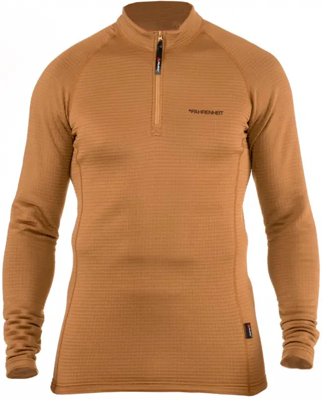 Термокофта Fahrenheit Power Grid Zip XXL/S CoyoteТермокофта Fahrenheit Power Grid Zip пошита из приятного к телу материала Polartec Power Grid, за счет которого были достигнуты высокие дышащие и влагоотводящие показатели. Одежда из Polartec Power Grid HWT является отличным бельем второго слоя для холодной погоды. Благодаря специальным насечкам на ткани одежда из нее подойдет для использования как для активной, так и для статической деятельности. Специально разработанная структура позволяет ткани быстро высыхать, в то время как внутренний велюровый слой «дышит» и согревает. Легкая и эластичная кофта отлично подойдет как для рыбалки и активного отдыха, так и для повседневной носки в холодное время года. Плоские швы не натирают, а анатомический крой способствует идеальному прилеганию ткани к телу и тем самым не сковывает движения. Невысокий воротник с вшитой молнией дополнительно защитит шею от ветра и попадания снега под одежду. Термокофта Fahrenheit Polartec Power Grid Zip сохранит тело теплым в любых погодных условиях.