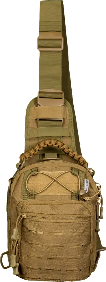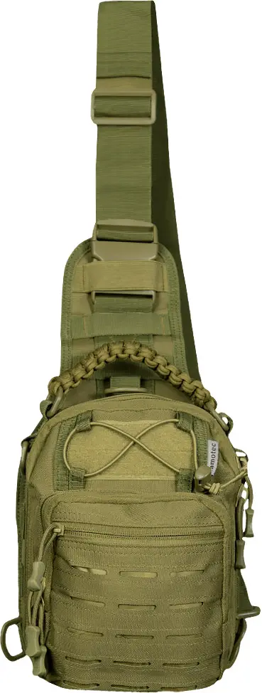 Широкая наплечная шлейка регулируется по длине и может быть зафиксирована как на левую, так и на правую сторону благодаря карабину и D-кольцам. При необходимости шлейку можно отстегнуть и спрятать в специальное отделение позади рюкзака. Для переноски рюкзак оснащен прочной ручкой из плетеного паракорда, который может быть использован в экстренных ситуациях.