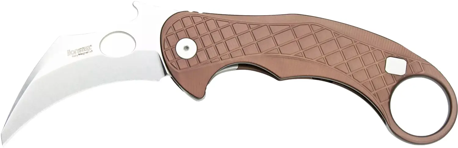 Клинок Lionsteel L.E.One имеет форму hawkbill с плейновым типом режущей кромки и финишную обработку stonewash или chemical black coating - химическое чернение (в зависимости от модели). Изготовлен из премиальной стали CPM MagnaCut - прочной, инструментальной стали, которая отличается высокой коррозионной стойкостью.