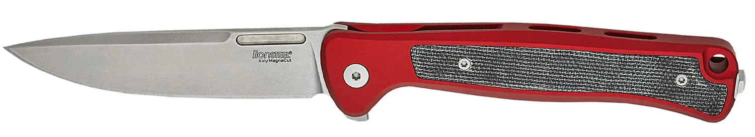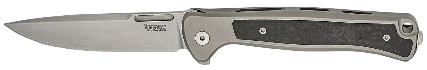 Клинок ножа изготовлен из премиальной стали CPM MagnaCut - прочной, инструментальной стали, которая отличается высокой коррозионной стойкостью. Клинок имеет профиль drop point, и обычную режущую кромку. В зависимости от модели, серия Skinny от Lionsteel может иметь финишную обработку stonewash или black stonewash. Клинок открывается флиппером и фиксируется с помощью фреймлока, который усилен стальной вставкой, чтобы предотвратить износ при долгосрочном использовании.