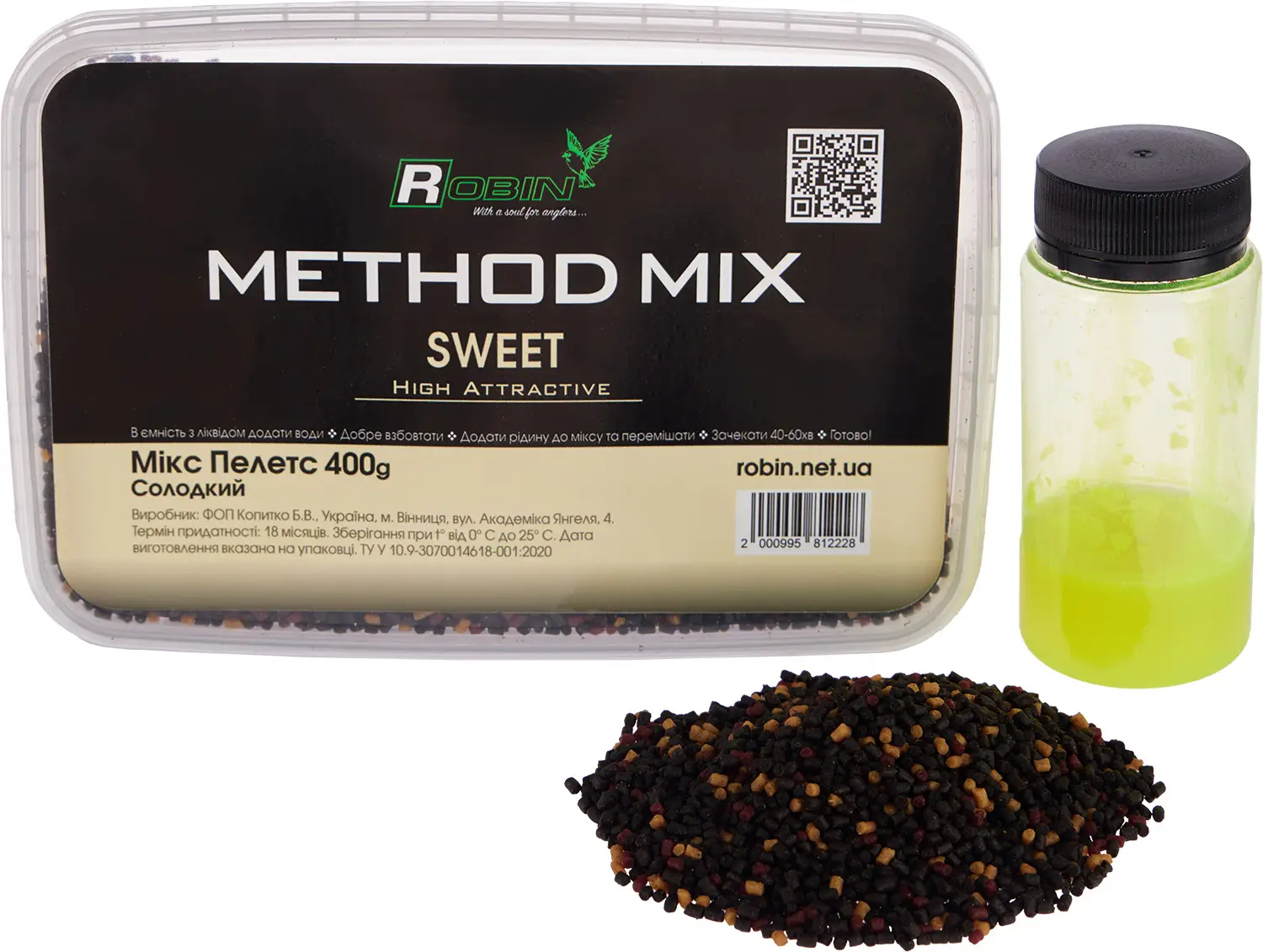 Метод Микс Robin High Attractive Corn-Honey 400гМетод Микс Robin High Attractive имеет насыщенный аромат, привлекает и удерживает рыбу на точке ловли. В состав входит коробка с пеллетами и баночка с ликводом с различными ароматами.