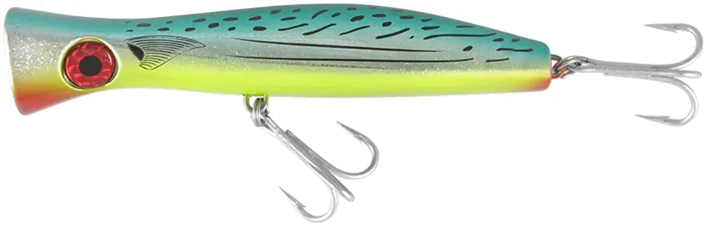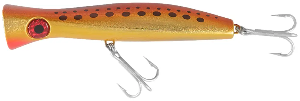 Воблер Halco Roosta Popper 195F 195mm 117.0g R25Воблер Halco Roosta Popper - серия специализированных поверхностных приманок для ловли хищника в южных морях. Это классический поппер, поэтому во время рывковой проводки он создаёт много шума на поверхности с отчётливыми хлюпающими звуками. Рыба с большого расстояния реагирует на такое поведение и подходит поближе, чтобы заполучить себе лёгкую добычу. Поэтому Roosta Popper хорошо работает по большим площадям в качестве разведчика на наличие активного хищника. Приманка выполнена из прочного пластика и оснащена мощными крючками, защищёнными от образования коррозии, это позволяет ловить даже очень крупную рыбу в самых экстремальных условиях.